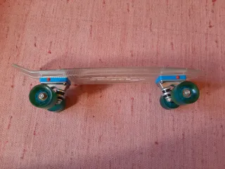 Monopatín transparente con ruedas azules