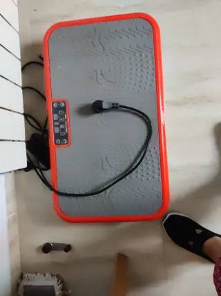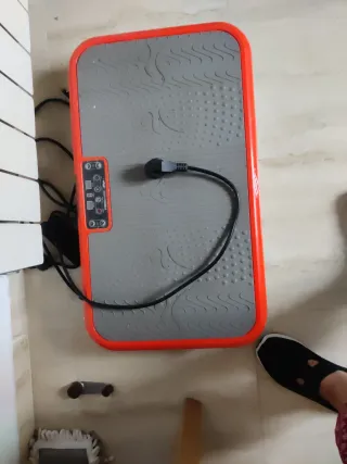 Plataforma vibratoria para fitness con muy poco uso. - Diseño moderno con marco naranja. - Superficie de agarre texturizada en gris. - Panel de control integrado con botones.