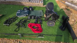 Lote completo de equitación - Dos cabezadas. Full - 1 filete nuevo - 2 Riendas. - Botas de picadero negras. - Cuerda 8 metros - Protectores Gatusos talla M, campana, menudillo y delanteros tendoneras - Tralla 5,5 metros - Fusta pequeña de doma y salto - Sudadero verde Zaldi - Kit de limpieza y mantenimiento completo - Casco 55 - Casco 52 (Silla y manta de las fotos vendidas)