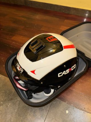 Casco de esquí CASCO en talla L-XL, diseñado para competición. Incluye gafas de esquí CASCO - Color blanco con detalles en negro y rojo. - Incluye sistema de ventilación. - Cierre ajustable.