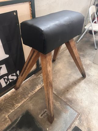 Caballo de gimnasia antiguo, ideal para ejercicios. Es de madera y tiene una tapicería negra. - Estructura de madera resistente. - Tapizado negro en buen estado. - Diseño clásico y robusto. - 100€ pequeño 200€ el grande si es por separado