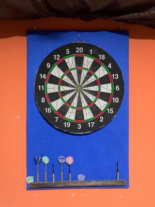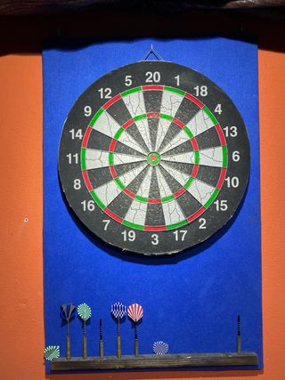 Juego de diana de dardos con puntas de acero. Está en buenas condiciones, lista para usar. - Incluye diana de dardos. - Se incluyen unos 20 dardos con plumas de colores. - Soporte para dardos incluido. - Plumas de repuesto - Afilador de puntas - Funda para guardarlos