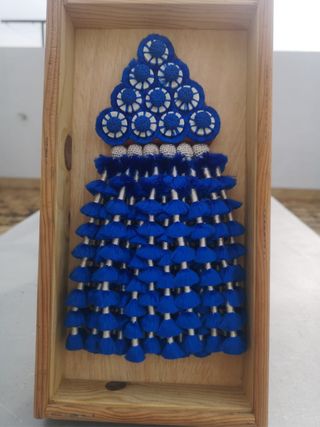 Precioso mosquero de cerda artesanal, ideal para decoración. Luce una combinación de azules y blancos muy elegante. - Elaborado con materiales de calidad. - Diseño único y llamativo. - Perfecto para añadir un toque de estilo a cualquier espacio. - Nueva en su caja de madera.