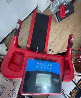 Cinta de correr marca Deluxe 13 Fitness en color rojo. - Diseño plegable para fácil almacenamiento. - Pantalla digital para seguimiento de datos. - Controles de velocidad y programa en el manillar.