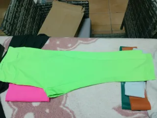 Lote de ropa deportiva para mujer, ideal para entrenamientos. - Mallas deportivas color verde neón. - Prenda interior color rosa. - Bandas elásticas de resistencia en varios colores (verde, naranja, azul claro).