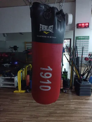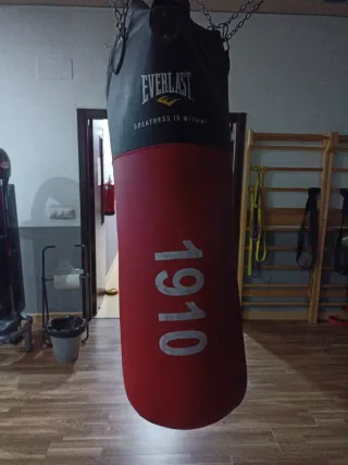 Saco de boxeo Everlast con el número 1910. - Marca: Everlast - Diseño: Dos tonos (negro y rojo) - Número visible: 1910