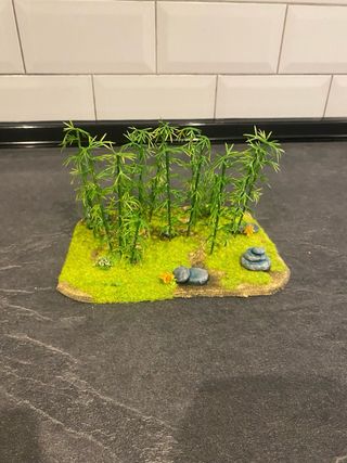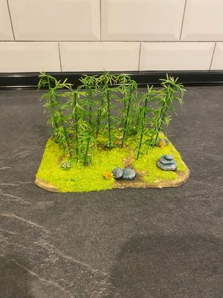 Escenario de bambú para miniaturas de Warhammer Fantasía. Ideal para crear un ambiente oriental. - Base con césped artificial y detalles. - Figuras de bambú de plástico verde. - Rocas decorativas y pequeñas flores.
