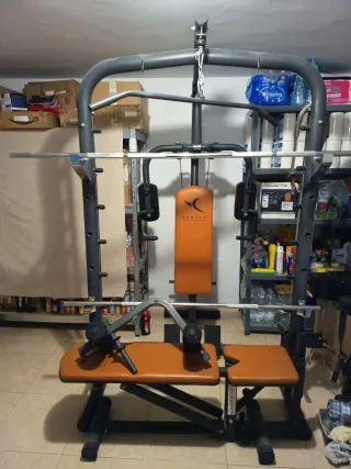 Equipo de musculación completo para entrenar en casa. - Estructura robusta de acero. - Incluye banco ajustable. - Incorpora poleas y barra. - Diseñada para diversos ejercicios. Como nuevo