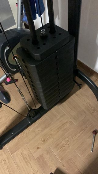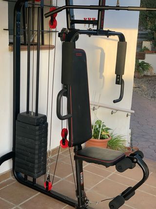 Está como nueva, tiene poco uso, urge vender. Lo único que se puede decir es que al montarla, a una de las sirgas de las poleas se le abrió un poco el plástico exterior de la siega, se tapó con cinta aislante. No se ve porque es en la arte de arriba y no ha dado ningún problema. Máquina multiestación compact con cargas guiadas Home Gym Corength, para tus sesiones de musculación en casa. Puedes ajustar el peso con cargas guiadas de 5 en 5kg hasta 60kg. Entrenamiento seguro y cómodo en casa. Con este home gym podrás trabajar todos los grupos musculares con total seguridad gracias a las cargas guiadas. Ideal para empezar. Urgente