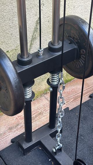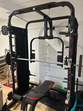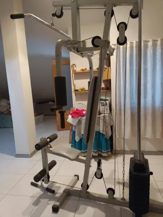Maquina de musculación muy completa y robusta. Ideal para trabajar todo el cuerpo en casa o gimnasio personal. - Estructura robusta y estable. - Incluye barra maciza 2 metros. - Barra guiada para ejercicios seguros. - Unos 80 y pico kg en pesas. - Accesorios para diferentes ejercicios. - 2 poleas altas y una polea baja. - Banco ajustable en 5 posiciones. Como nueva, poco uso y bien cuidada.