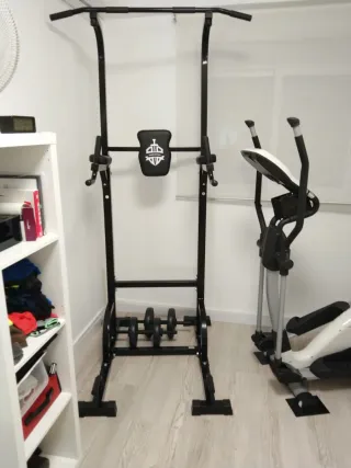 Equipo de musculación versátil para entrenar en casa. Puedes trabajar todo el cuerpo, es muy compacta y de calidad aguanta más de 150 kilos de peso, está nueva, nunca se ha usado, es muy estable, su precio nuevas es de 275€ yo la vendo a muy buen precio, buena oportunidad. - Barra de dominadas integrada. - Estructura robusta de acero. - Acolchado para mayor comodidad. Por cierto la estructura es de acero inoxidable y no de hierro que se oxidará y tendrás que tirarla y comprar otra, con la mía eso no te pasará nunca , esto es muy importante.