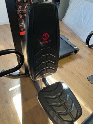 Aparato de gimnasio para entrenar en casa. Cuenta con un diseño robusto y asiento acolchado. - Estructura de metal negro. - Asiento y respaldo en color rojo. - Torre de pesas incluida. - Las almohadillas de espuma protectoras de la rodilla están un poco desgastadas pero funcionan bien.