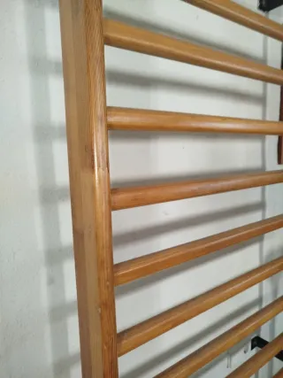 Espaldar de madera para ejercicios y entrenamiento. - Estructura de madera resistente. - Múltiples barras para diferentes ejercicios. - Ideal para gimnasios o uso doméstico. Medidas, 0.90 de ancho y 2,40 de alto