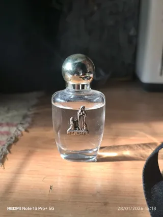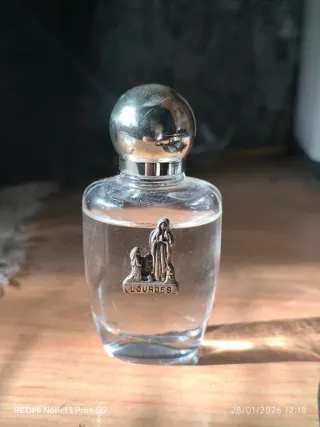 Pequeña botella de agua bendita de Lourdes con figura. - Botella de cristal transparente. - Figura religiosa en relieve. - Tapón plateado.