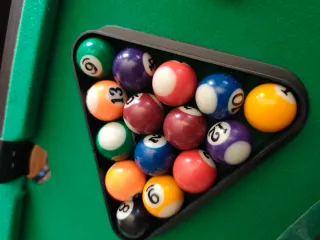 Mini mesa de billar para jugar en casa. Incluye todo lo necesario para empezar a jugar. - Mesa de billar verde. - Triángulo con bolas de billar. - Bola blanca. - Dos tacos de billar. - Tiza azul.