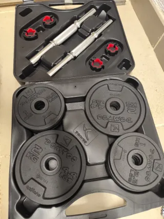 Kit de pesas para entrenamiento de bodybuilding. - Maletín negro para transporte y almacenamiento. - 4 discos de 2kg,8 discos de 1 kg.