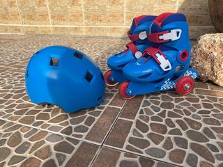 Conjunto de patines y casco para niños. - Patines ajustables talla 26-28. - Casco protector azul.