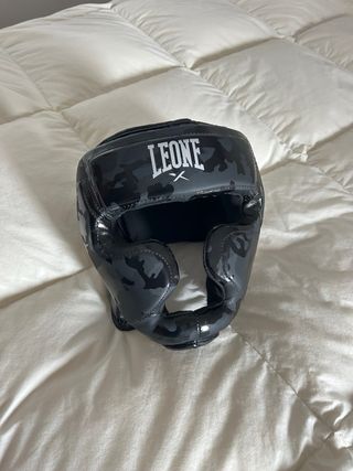 Casco de boxeo de la marca Leone con un diseño de camuflaje moderno. Talla M. - Diseño de camuflaje en tonos grises y negros. - Marca Leone visible en la parte superior. Ha sido usado en tres ocasiones como mucho.
