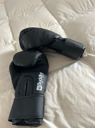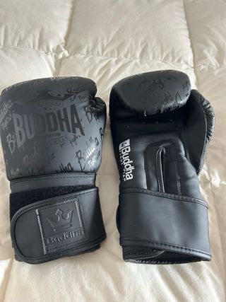 Par de guantes de boxeo de la marca Buddha. - Color negro. - Tamaño 12 OZ. - Diseño con logo de Buddha Fight Wear. Unsado en tres ocasiones como mucho .ñññ