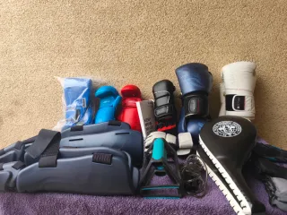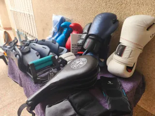 - Guantes de Karate azules (L) - Guantes de karate rojos (L) - Mitones de negros (L) - Guantes de Kick boxing/MuayThai (14oz) - Guantes de Boxeo básicos (Nuevos) - Guantes de boxeo blancos ergonómicos (12oz) - 2 pares de Espinilleras Karate MMA - Coderas (xs) - Un par de manoplas de Boxeo/Taekowndo - Una comba y bases para flexiones. - Un pack de bandas elásticas (Fokky), para estiramientos de yoga, etc. - 2 pares de protectores de nudillos de gomaespuma. Con la compra del paquete te llevas gratis la bicicleta estática que hay en mi perfil, y podría hacer descuento en algún otro artículo. Todo sin olores. Listo para entrega