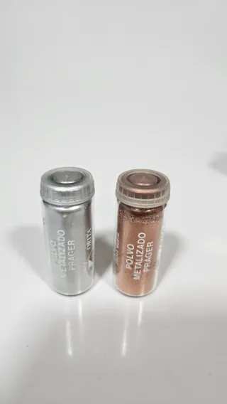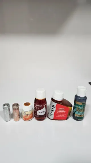 Conjunto de materiales para manualidades. - Botella de goma laca. - Botella de aceite de almendras. - Botella de barniz. - Botella de tinte. - Botella de pigmento.