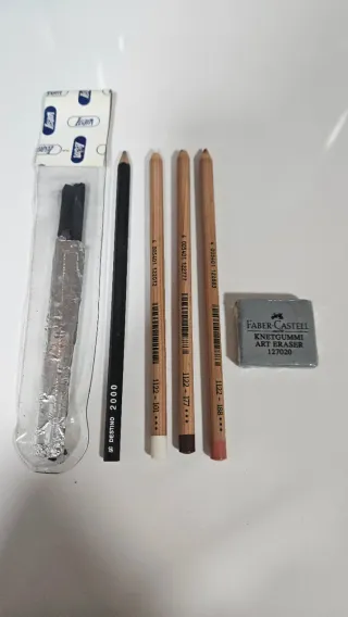 Set de materiales de dibujo que incluye lápices de grafito y carboncillo, además de una goma de borrar. - Lápiz de carboncillo Destino 2000. - Lápices de grafito Faber-Castell con diferentes tonalidades. - Goma de borrar Faber-Castell Knetgummi Art Eraser.