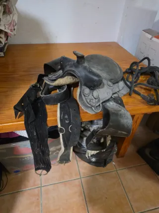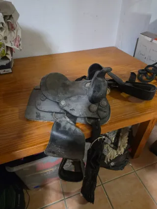 Silla de montar de cuero para pony. Incluye cincha y riendas. - Silla de montar de cuero. - Cincha de tela y cuero. - Riendas de cuerda.