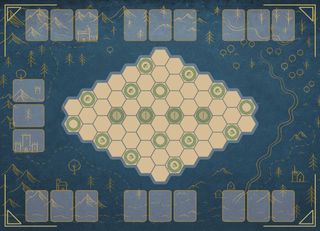 Tapete de juego grande para Warchest. Diseñado con un fondo azul oscuro y detalles dorados. Miden unos 90x60cm Fabricado en punto de neopreno con foam de 2mm y borde remallado. 2 modelos a escoger - Diseño temático con montañas, árboles y caminos. - Área central hexagonal para el tablero de juego. - Zonas laterales para cartas y puntuación.