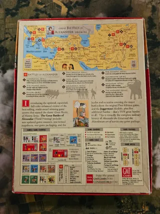 Juego de guerra The Great Battles of Alexander Deluxe Edition de GMT Games. - Basado en el arte de la guerra macedonia. - Incluye batallas como Queronea, Gránico, Issos, Gaugamela, etc. - Edición de lujo. - Publicado en 2003. - Caja un poco desgastado de uso.