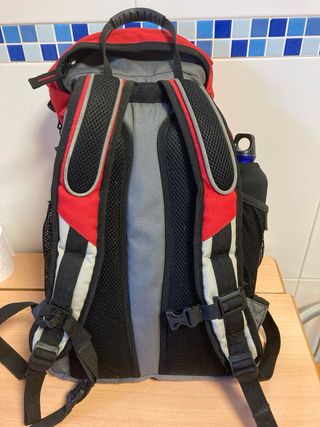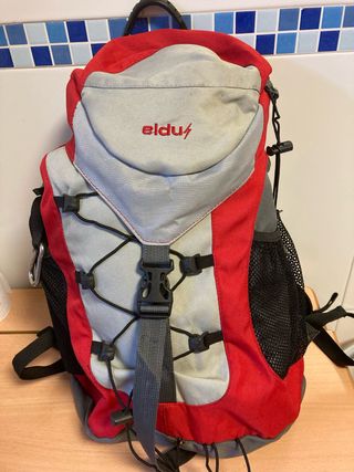 Mochila de montaña y trekking en color rojo y gris, con logo de la marca Eldu. - Compartimento principal espacioso. - Bolsillos laterales de malla. - Correas ajustables y acolchadas. - Cierre de clip frontal. - Dos compartimentos con cremallera
