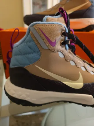 Botas Nike Terrascout en tonos marrones, azules y detalles morados. Perfectas para senderismo o uso diario. TALLA 38.5 - Diseño de caña alta. - Suela de goma resistente. - Cierre con cordones negros. - Logo de Nike en color crema.