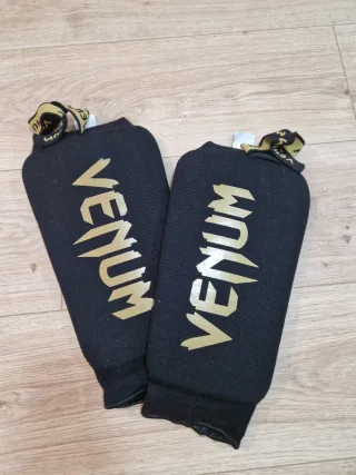 Par de espinilleras de la marca Venum en color negro con detalles dorados. Mma, bjj, jiu jitsu, muay thai, kick boxing, grappling - Diseño con logo Venum. - Cierre con cintas.
