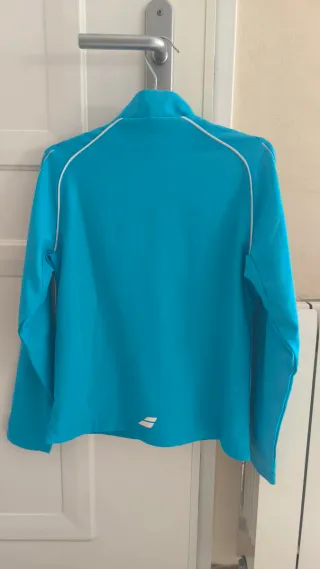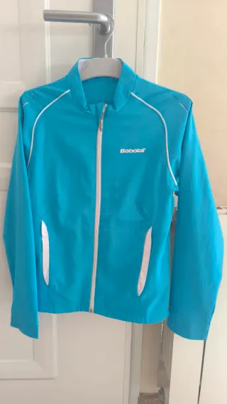 Chaqueta deportiva Babolat para niña en color azul. - Talla 8-10 años. - Tejido ligero. - Diseño con detalles blancos. - Cierre de cremallera frontal. - Cuello redondo. - Dos bolsillos laterales.