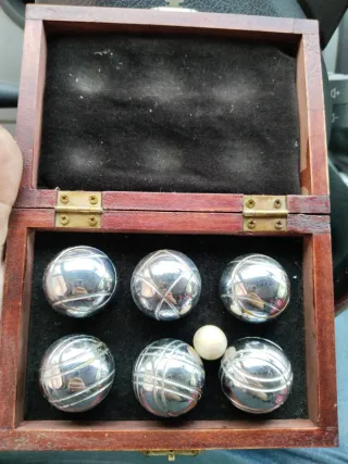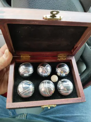 Set de bolas de petanca de tamaño mini, ideal para partidas. - Incluye 6 bolas metálicas. - Incluye 1 bola pequeña de lanzamiento. - Vienen en una caja de madera.