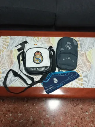 Conjunto de tres artículos del Real Madrid. - Bolso pequeño con correa. - Estuche grande - Estuche pequeño con diseño de zapatilla.