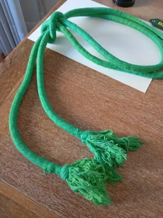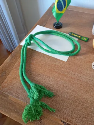 Cuerda de capoeira de color verde vibrante, con un nudo central y dos elaboradas borlas en los extremos. - Material: Cuerda trenzada. - Color: Verde. - Diseño: Nudo central y borlas. - Longitud: Aproximadamente 2 metros.