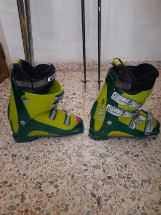 Conjunto de esquí completo, ideal para disfrutar de la nieve. - Botas de esquí de color verde y amarillo. - Bastones de esquí negros.