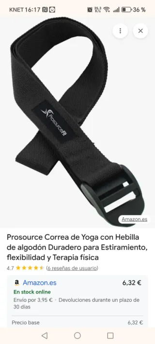 Correa de yoga Prosource Fit de algodón con hebilla. Ideal para estiramientos y terapia física. - Material: Algodón duradero. - Cierre: Hebilla ajustable. - Uso: Yoga, estiramientos, terapia física.