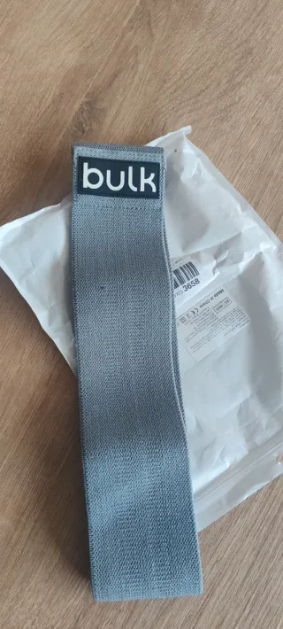 Banda de resistencia corta, ideal para ejercicios. - Color gris. - Logo de la marca 'bulk' en blanco.