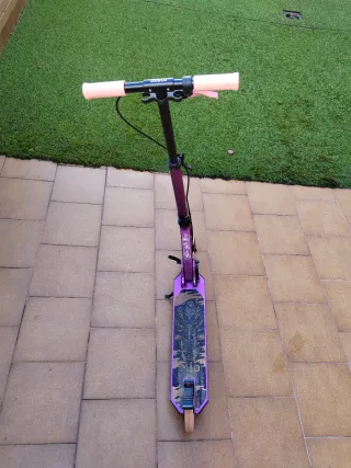 Patinete de la marca Oxelo en color morado. - Manillar ajustable. - Ruedas de color claro. - Plataforma con diseño gráfico.