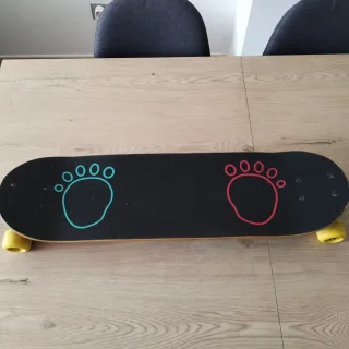 Skate con diseño llamativo y base negra. - Dibujo de huella azul en un extremo. - Dibujo de huella roja en el otro extremo. - Ruedas amarillas.