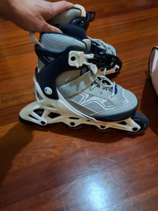 Patines en línea de la marca Oxelo, comprados en Decathlon. Diseñados para ofrecer comodidad y buen rendimiento. - Color gris y negro. - Cierre de velcro y hebilla. - Ruedas de 70 mm.