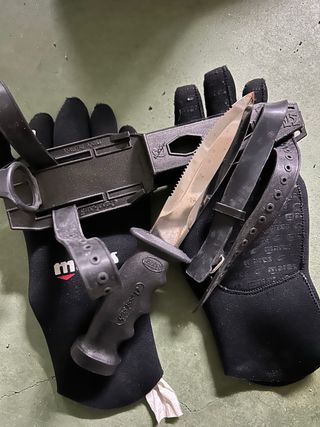 Cuchillo de buceo Cressi Sub Totem en buen estado. - Incluye funda y correas de sujeción. - Mango ergonómico con seguro.