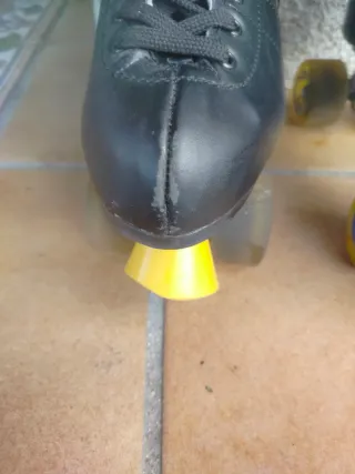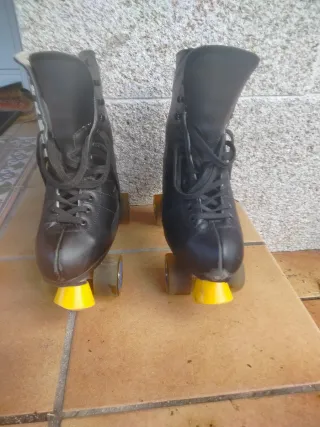 Par de patines clásicos en color negro. - Bota alta de cuero sintético. - Cordones negros. - Ruedas de goma. - Topes de freno amarillos. - número 40