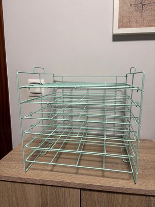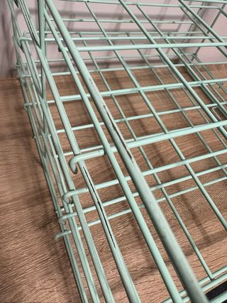 Práctica estantería de alambre en color verde menta, ideal para organizar papeles de scrapbooking o documentos. - Diseño de rejilla. - Múltiples niveles para almacenamiento. Tiene algún rasguño como se aprecia en las fotos pero no afecta a su uso.