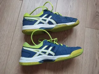 Zapatillas de pádel Asics Gel-Padel Pro en color azul y lima. - Diseño deportivo. - Cierre de cordones. - Suela de goma. usadas, bastante buen estado en general y de suela, desgaste en la parte exterior del pie como se ve en la última foto.