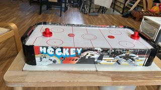 Divertida mesa de hockey de aire para horas de entretenimiento. - Diseño con temática de hockey. - Incluye porterías y discos.