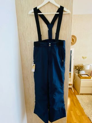 Pantalón Decatlón cálido e impermeable, provisto del sistema PULL'N FIT ZIP para ajustar el largo de las perneras fácilmente. La cintura y los tirantes (desmontables) también se pueden ajustar. - Color azul marino. - Talla 12-14. - Cierre de cremallera y botones. - Bolsillos laterales con cremallera.