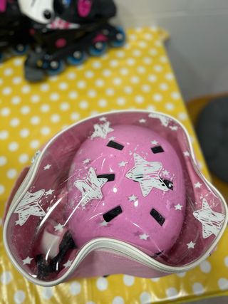 Set de casco y protecciones para patinar. - Casco de color rosa con diseño de estrellas blancas. - Incluye bolsa de transporte con cremallera y detalles transparentes.