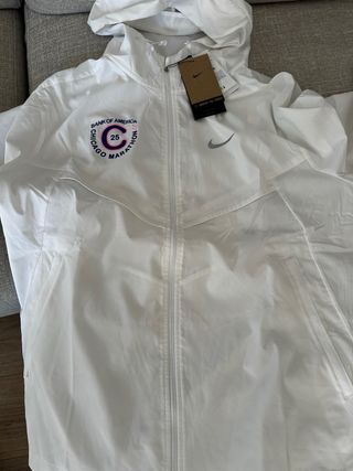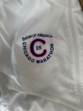 Chaqueta deportiva Nike para el Maratón de Chicago 2025. Diseño moderno y ligero. - Color blanco con detalles en azul marino y rosa. - Talla M. - Comprado en la expo de la maraton y lo vendo porque queda pequeño a la persona que se lo traje. - Con etiquetas y sin estrenar. - Logo del Maratón de Chicago y Bank of America. - Cierre de cremallera frontal. - Bolsillo interno psra guardar y transportar